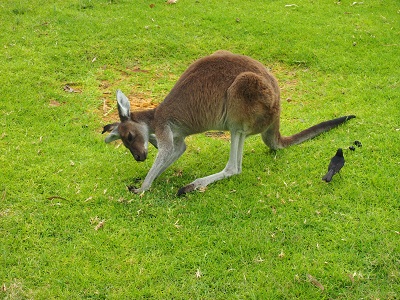 Nach den auf Rottnest gesichteten Raben der nächste schräge Vogel: Ein Kängaruhschreck. Ein kleiner Spatz der fortwährend und ohne erkennbaren Grund den Schwanz eines grasenden Kängaruhwallabys attackiert - welches sich davon aber nicht weiter beeindrucken läßt.